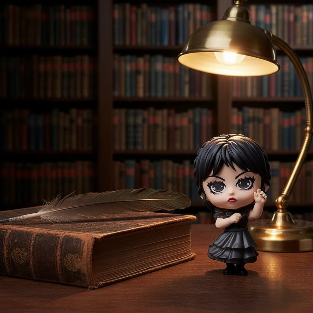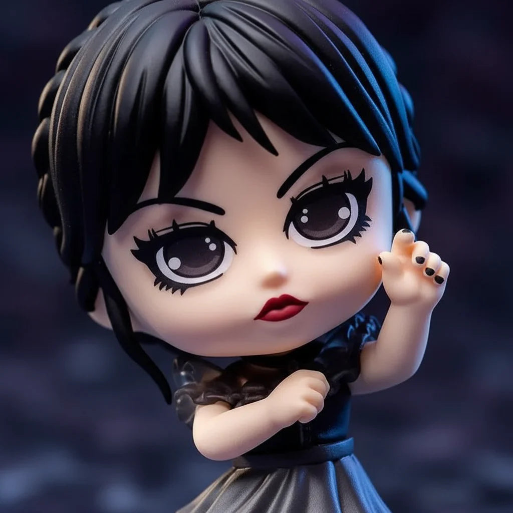C'est son style chibi unique, ses grands yeux expressifs et son look gothique détaillé qui la rendent incontournable. Elle capture parfaitement l'essence de Mercredi avec une touche d'adorabilité!