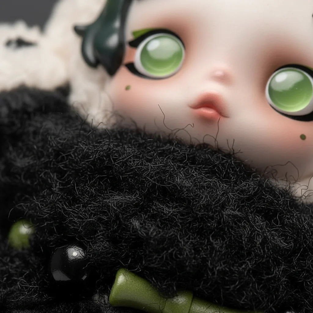 Oubliez le banal. Ce Skullpanda est une explosion de personnalité avec ses yeux verts vifs et son costume de panda.